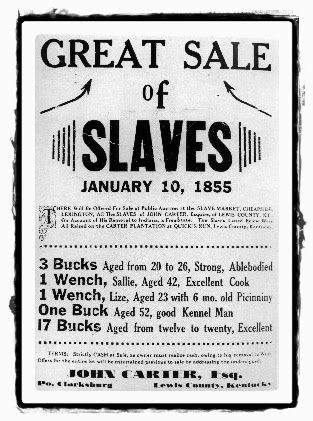 I 23 schiavi indicati in questo volantino appartenevano ad un coltivatore del Kentucky, tale John Carter, che decise di "liquidare il proprio patrimonio" prima di spostarsi nello stato libero dell'Indiana.